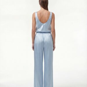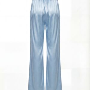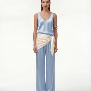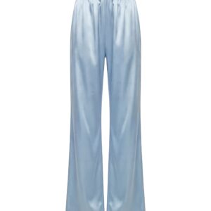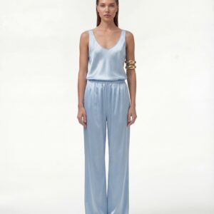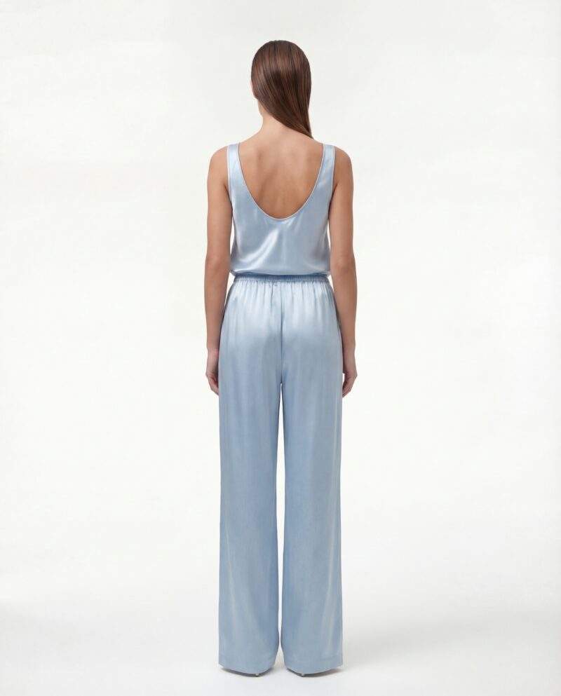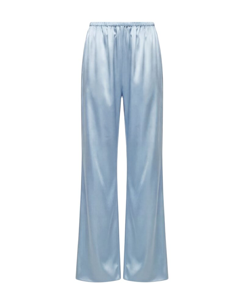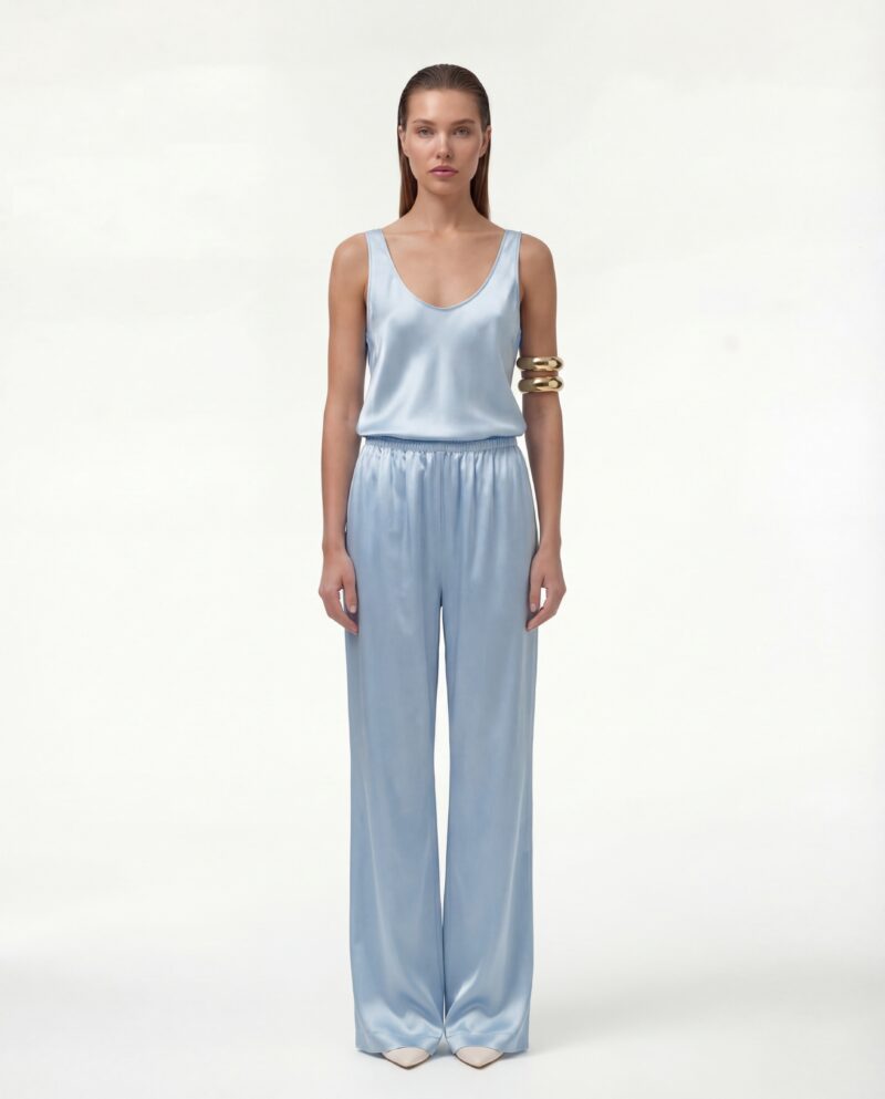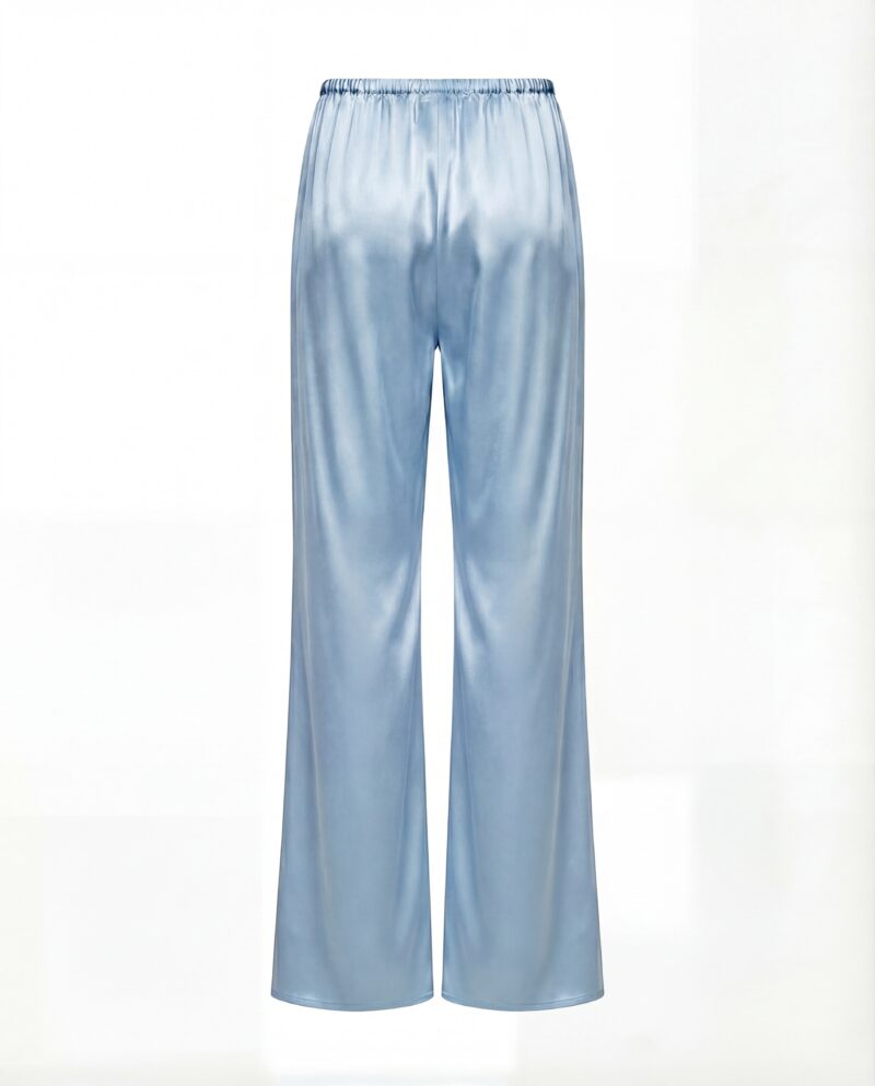 Made of natural, fluidly draping silk, they create a soft, elongated silhouette and a feeling of absolute lightness. The straight, slightly flared cut, combined with an elastic waistband, allows the trousers to fit the body without feeling constricted.