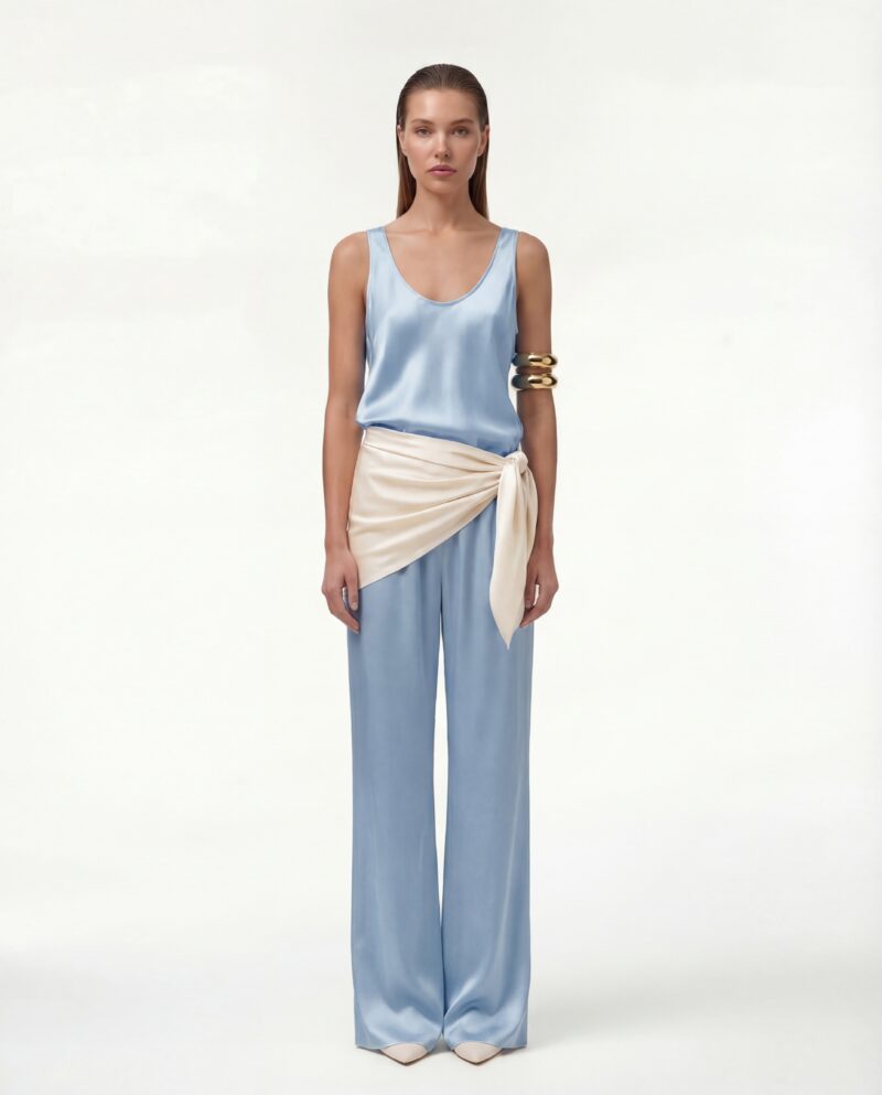 Silk satin subtly reflects light, highlighting the material’s elegance. This style easily transitions from daytime elegance to evening casualness – wear it with a silk top, shirt, or jacket.