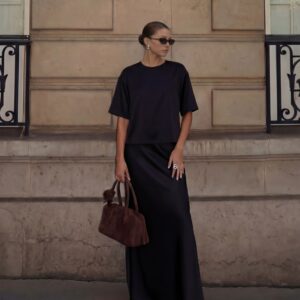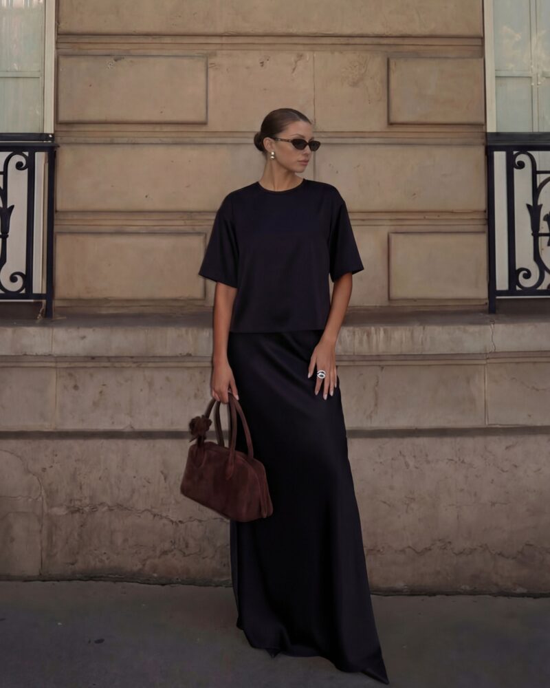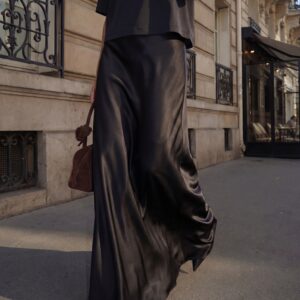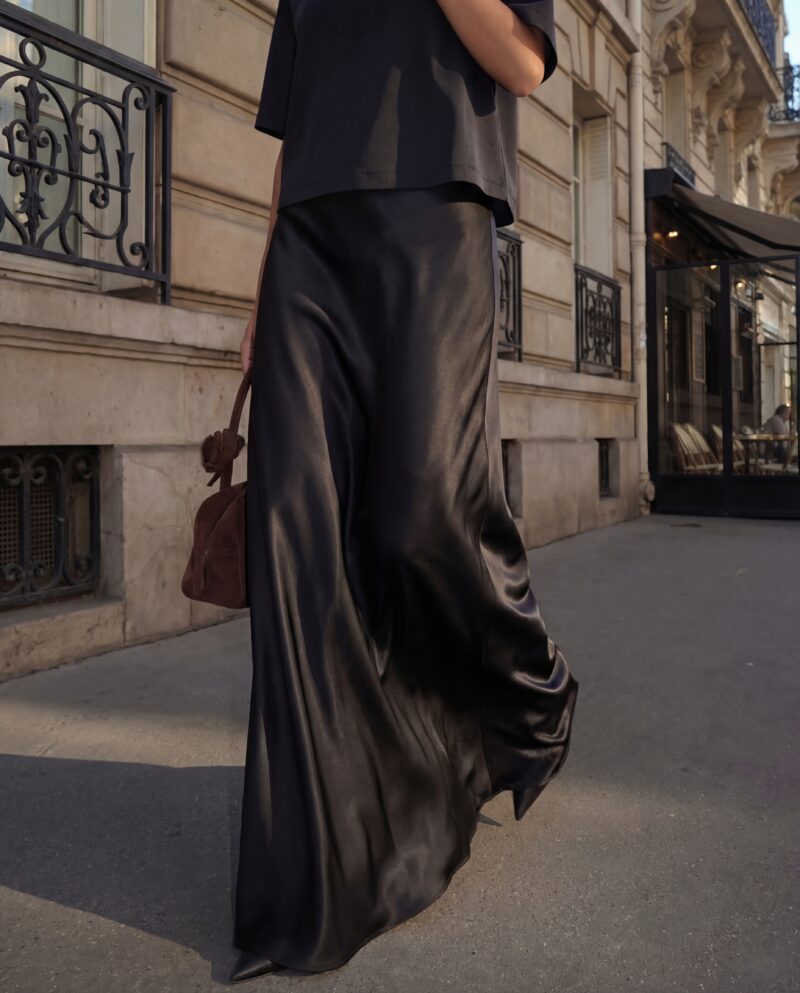 The high-waisted silk skirt gracefully emphasizes your curves thanks to its diagonal cut, and the smooth silk will feel like a second skin on you.