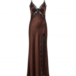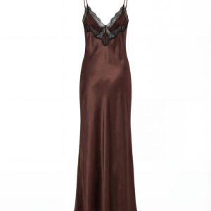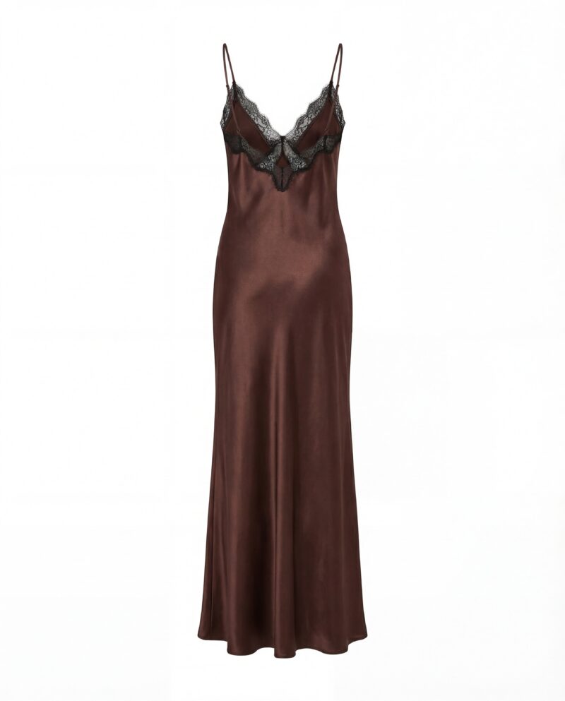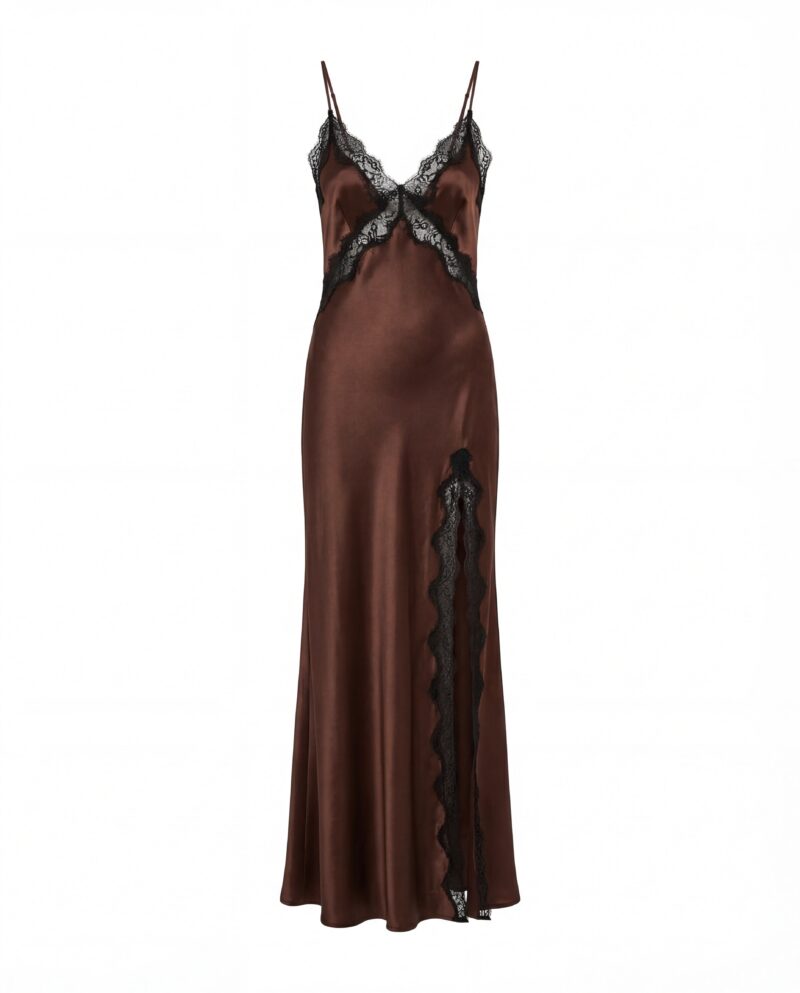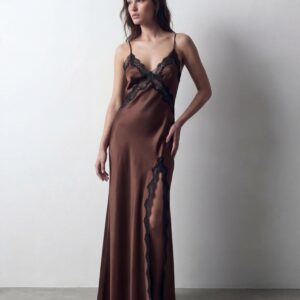 Made of natural silk satin, it softly flows around the figure, while contrasting lace delicately accentuates the bust and legs, creating a light and feminine effect. The deep cutout at the back and adjustable straps give the dress a sensual yet effortless character.