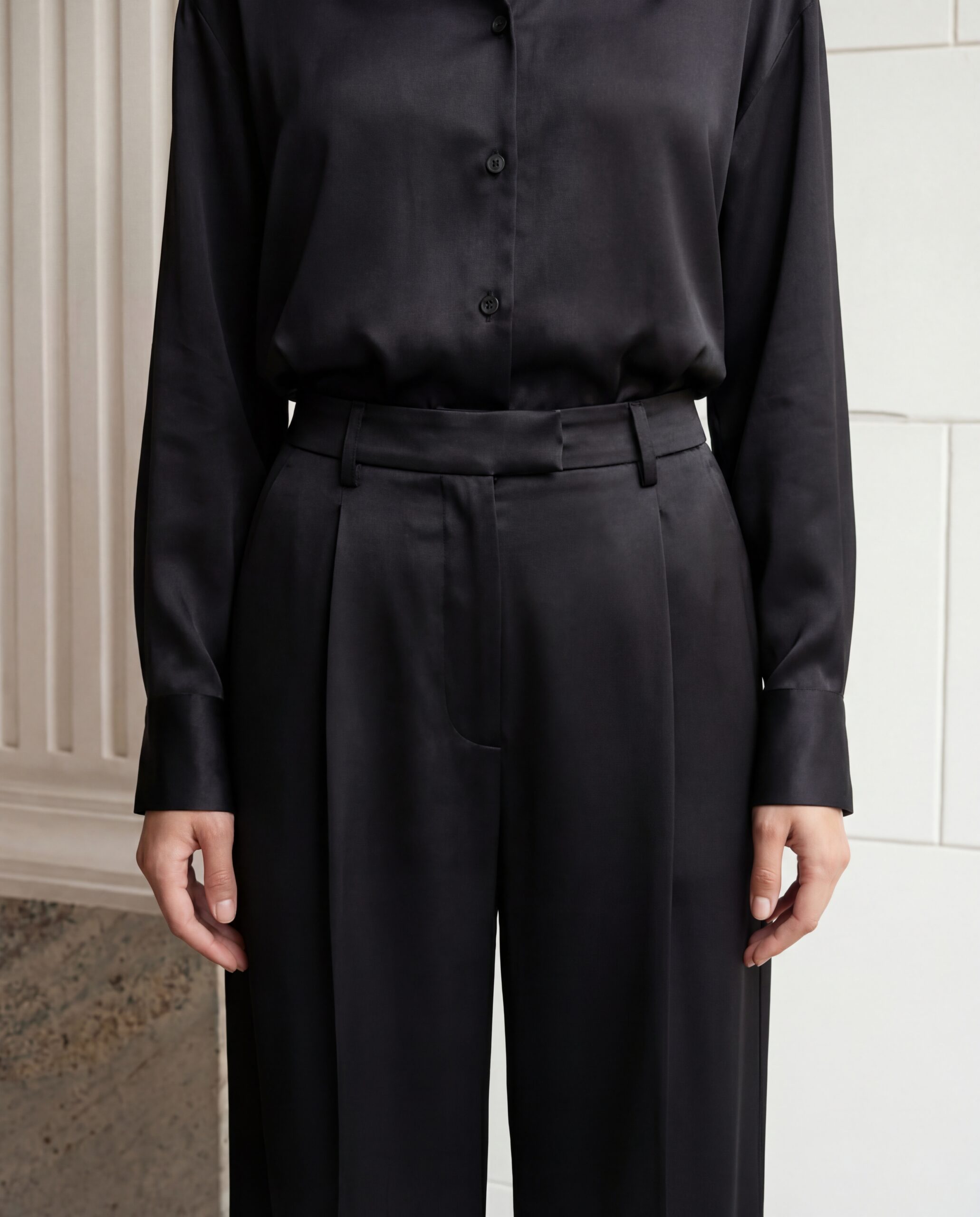 This blouse is the embodiment of luxury and refined style. Crafted from the highest quality silk satin, it captivates with its smooth texture and noble sheen. Its design blends elegance with modern detailing. The front features a subtle V-neckline that optically elongates the neck. The most distinctive element is the scarf, adorned with long fringes that add dynamism and nonchalance to the look. The ensemble is completed by elegant, puffed sleeves finished with wide cuffs. It is a timeless piece that works perfectly for both evening wear and more minimalist daily outfits, creating a look full of class and effortless ease.