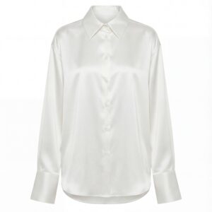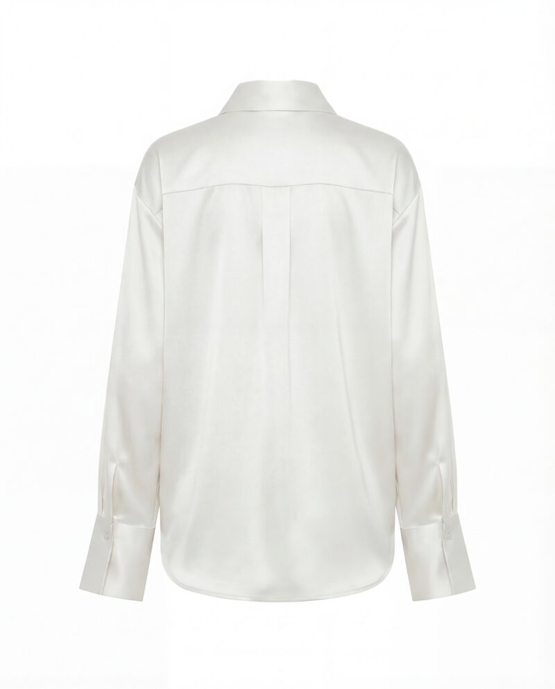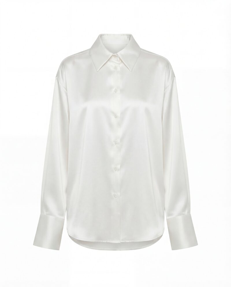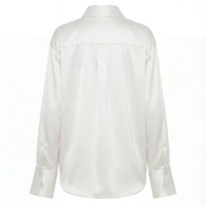 The classic collar and slightly elongated cuffs give the shirt a refined character, while the subtle sheen of the fabric plays beautifully with movement and light. The loose fit allows it to be worn with both formal and more sensual outfits—unbuttoned, casually tucked into trousers, or tied at the waist.
